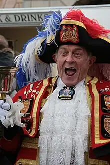 Appleton later trained as a toastmaster and has opened events in Milan, Amsterdam, and Las Vegas. Appleton recalls being told by a young child at a fete opening that "he looked like a town crier", and having "never looked back" since then. In the early 2000s, Appleton became the official town crier of Romford in Essex.[2] Appleton cites himself as the President of the Guild of International Millennium Town Criers on his website.[3] Appleton later had unofficial crier duties at the 2011 wedding of Prince William and Catherine Middleton, the 2012 Diamond Jubilee of Queen Elizabeth II, and the 2012 Summer Olympics closing ceremony.[3]