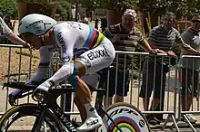 Martin spent two days in the leader's jersey at the Volta ao Algarve in February, having finished second on the third stage – an individual time trial – before losing the lead on the final day.[75][76] He finished fourth overall at March's Three Days of De Panne, again finishing second on an individual time trial stage.[77] He took his first victory of the season, with his fifth consecutive victory (and sixth overall) in the German National Time Trial Championships in June.[78] He won the individual time trial at the Tour of Britain,[79] and finished his season with gold medals in both the team time trial and the individual time trial at the UCI Road World Championships.[80][81]
