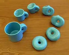 Intuitively, two spaces are homeomorphic if one can be deformed into the other without cutting or gluing. A traditional joke is that a topologist cannot distinguish a coffee mug from a doughnut, since a sufficiently pliable doughnut could be reshaped to a coffee cup by creating a dimple and progressively enlarging it, while shrinking the hole into a handle.[1]