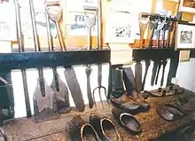 In the room next to the hall there are original tools and devices for peat cutting, manual agriculture and clog-making were professionally conserved and are shown as exhibits.[62] Also shown are so-called Brettholschen, mire clogs distributing the weight of the person over a larger area so that the person's foot does not bog down completely.[65] Furthermore, there are a small tin stove on which bargemen on tour warmed up their soup, and a traditional wooden butter churn.[2] Tablets, wall charts, and photos give explanations about draining, cultivating and colonising boglands, an exhibition started in 1981 and renewed and extended ever since.[66] In 1981 the Traditions Club began issuing information brochures on the museum and the subjects it covers, such as colonising boglands, peat-cutting, turf barges etc.[67] Since 1984 the museum also published postcards.[68]