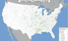 ![]() Map of the 2018 United States tornado paths from the results of storm surveys map data) | |