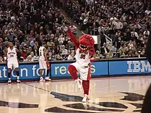 Initial sentiment was in favour of reviving the Huskies nickname, but team management realized it would be nearly impossible to design a logo that did not substantially resemble that of the Minnesota Timberwolves to avoid confusion with that team.[18] As a result, a nationwide contest was held to help name the team and develop their colours and logo. Over 2,000 entries were narrowed down to eleven prospects: Beavers, Bobcats, Dragons, Grizzlies, Hogs, Raptors, Scorpions, T-Rex, Tarantulas, Terriers and Towers (the eventual runner-up).[1] The final selection—Toronto Raptors—was unveiled on Canadian national television on May 15, 1994:[1] the choice was influenced by the popularity of the 1993 film adaption of the 1990 science fiction novel Jurassic Park by Michael Crichton; The name "Raptor" is a common informal name for the Velociraptor, a species of dinosaur featured in the film. On May 24, 1994, the team's logo and first general manager, Isiah Thomas, were revealed at a press conference.[1] As part of the deal, Thomas received an option to purchase part of the team, reportedly for under market value.[19][20] He would purchase 4.5 per cent in May 1995[21][22] and a further 4.5 per cent in December 1995,[20][23] half each from Bitove and Slaight, decreasing their share to 39.5 per cent.[1][24] The team's colours of bright red, purple, black, and silver were also revealed; "Naismith" silver was chosen to honour Canadian James Naismith, the inventor of basketball.[1] The team originally competed in the Central Division,[25] and before the inaugural season began, sales of Raptors merchandise ranked seventh in the league, marking a successful return of professional basketball to Canada.[1]