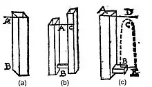 Evangelista Torricelli's original derivation can be found in the second book 'De motu aquarum' of his 'Opera Geometrica' (see [4]): He starts a tube AB (Figure (a)) filled up with water to the level A. Then a narrow opening is drilled at the level of B and connected to a second vertical tube BC. Due to the hydrostatic principle of communicating vessels the water lifts up to the same filling level AC in both tubes (Figure (b)). When finally the tube BC is removed (Figure (c)) the water should again lift up to this height, which is named AD in Figure (c). The reason for that behavior is the fact that a droplet's falling velocity from a height A to B is equal to the initial velocity that is needed to lift up a droplet from B to A.