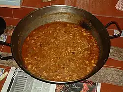 To prepare gazpachos the flat bread is torn or cut into small pieces and mixed with a somewhat liquid stew in order to prepare a warm dish. This dish originated in the hearty food shepherds needed when they came back home on cold winter nights. It is traditional to serve this dish by placing the pan or large plate in the middle and all the guests sitting around eating from it. Sometimes instead of the plate the gazpacho is poured on a very large flat bread.[2]