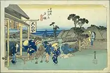 The classic ukiyo-e print by Andō Hiroshige (Hōeidō edition) from 1831–1834 depicts a traveler (one dismounting from a horse), entering into a tea-house. In the background, a wooden bridge leads across a stream to what appears to be a sizeable settlement.