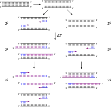 The touchdown polymerase chain reaction or touchdown style polymerase chain reaction is a method of polymerase chain reaction by which primers avoid amplifying nonspecific sequences.[1] The annealing temperature during a polymerase chain reaction determines the specificity of primer annealing. The melting point of the primer sets the upper limit on annealing temperature. At temperatures just above this point, only very specific base pairing between the primer and the template will occur. At lower temperatures, the primers bind less specifically. Nonspecific primer binding obscures polymerase chain reaction results, as the nonspecific sequences to which primers anneal in early steps of amplification will "swamp out" any specific sequences because of the exponential nature of polymerase amplification.[2]
