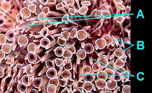 The second type are the globiferous pedicellariae which superficially resemble flowers (hence its common name).[21] These are more specialized and are used for defense against predators and larger ectoparasites. Globiferous pedicellariae also end in a three-valved claw-like grasping appendage, like they do in ophicephalous pedicellariae, but they are much larger.[19][22] The valves are connected to each other by a distinctive circular membrane around 4 to 5 mm (0.16 to 0.20 in) in diameter. They are pinkish-white to yellowish-white in color with a central purple dot and a bright white rim.[14][19] Each valve ends in a sharp fang-like tip which is capable of penetrating human skin.[18][23][24] The base of the valves also house venom glands.[19][25] Some authors further subdivide globiferous pedicellariae into two subtypes based on size - the trumpet pedicellariae and the giant pedicellariae.[21] The other two types of pedicellariae - tridentate and triphyllous - are rare or restricted only to certain areas of the test.[16]