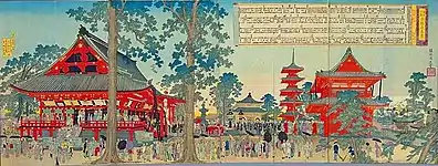 - ↑ one of which is a five panel print from the series, "The Imperial Ladies' Quarters at Chiyoda Palace" entitled, konrei (こんれい) The Marriage Ceremony and there is a four panel tetraptych displaying Golden Dragon Mountain in Asakusa Park. The other is a very well known nine-panel print entitled Meiji Sanjū-Ichi-Nen Shi-Gatsu Tōka: Tento Sanjū-Nen Shukugakai Yokyō Gyōretsu no Zu (明治31年4月10日: 奠都30年祝賀會餘興行列の図), The Procession in Commemoration of the Thirtieth Anniversary of the Transfer of the Capital.