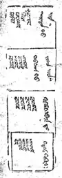 - ↑ Walther Heissig (1989). Heilung durch Zettelschlucken. Die Mongolen. Vol. 2. Innsbruck. ISBN 3-7016-2297-3.