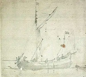 During the 17th century, the British developed the dogger, an early type of sailing trawler or longliner, which commonly operated in the North Sea. The dogger takes its name from the Dutch word dogger, meaning a fishing vessel which tows a trawl. Dutch trawling boats were common in the North Sea, and the word dogger was given to the area where they often fished, which became known as the Dogger Bank.[39] Doggers were slow but sturdy, capable of fishing in the rough conditions of the North Sea.[40] Like the herring buss, they were wide-beamed and bluff-bowed, but considerably smaller, about 15 metres long, a maximum beam of 4.5 m, a draught of 1.5 m, and displacing about 13 tonnes. They could carry a tonne of bait, three tonnes of salt, half a tonne each of food and firewood for the crew, and return with six tonnes of fish.[40] Decked areas forward and aft probably provided accommodation, storage and a cooking area. An anchor would have allowed extended periods fishing in the same spot, in waters up to 18 m deep. The dogger would also have carried a small open boat for maintaining lines and rowing ashore.[40]