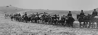 During the American Civil War, both the Union and Confederate armies tried to keep the size of their wagon trains in check to improve the tactical mobility of their forces.[8] This was measured as a ratio of the number of wagons per soldiers, with the idealized number according to Napoleon being of 12.5 wagons per 1,000 soldiers.[9] However, Napoleon benefitted from a densely populated Europe where food was plentiful. In the more sparsely populated South, where armies were more reliant on supply lines, the ratio was between 25 and 35 wagons per 1,000 men (a similar ratio was maintained after the war out on the American frontier).[10] In general, the Confederates managed a lower ratio compared to Union forces, although this was borne out of necessity instead of choice.[9]