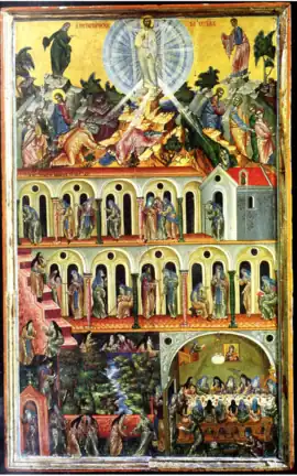 Transfiguration and Monastic Scenes is a multi-themed tempera painting created by Greek painter Georgios Klontzas. Klontzas was a Cretan Renaissance painter. The artist was hired to assess work completed by El Greco. Klontzas was from a wealthy family and owned a successful workshop in the center of Crete. His existing catalog consists of Fifty-four works. He completed incredible triptychs and manuscripts. Klontzas and Micheal Damaskinos are two of the most prominent Greek painters of the 16th century due to the size of their catalogs and the popularity of their works excluding El Greco.[1][2]