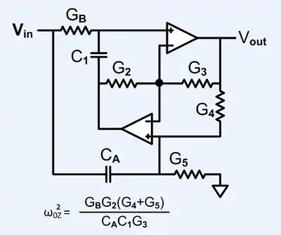 The circuit depicted to the left, based on a GIC (generalized impedance converter), has finite non-zero transmission zeroes.[1]: 304–308