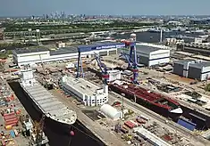 After the conversion of the Naval Yard for civilian uses, the Norwegian company Kværner rebuilt the western facility for commercial shipbuilding operations in partnership with the City of Philadelphia. Now called the Aker Philadelphia Shipyard, the yard opened in 2000 and delivered its first vessel in 2003.[37] The Aker Shipyard has built twelve ships, and has four vessels under construction.[38]