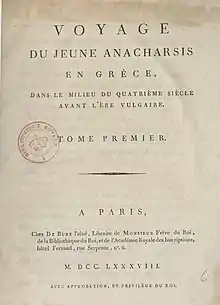 Jean-Jacques Barthélemy's book was a fanciful but learned imaginary travel journal, one of the first historical novels, which a modern scholar has called "the encyclopedia of the new cult of the antique" in the late 18th century.[1]