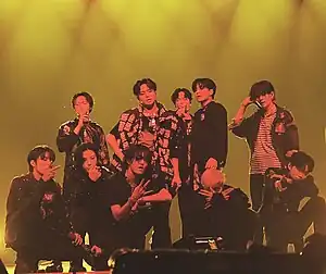 The ten-piece reunited with the Black Clover franchise for its theatrical soundtrack, with "Here I Stand".[80] It became their first number one hit on the Billboard Japan Hot 100,[81] and first platinum certification awarded by the RIAJ ensued from its integration into their Japanese single album of the same title.[82] Its certification was attained five days following its release on March 29, 2023,[82] and placed second on the Oricon Weekly chart with 235,347 copies sold,[83] generating ¥464.4 million ($3.51 million) in five days.[84] The band toured for two months across five cities of Japan for a nationwide fan meeting until its completion on November 12, 2023.[85] It resulted them to visit an audience of half a million attendees across all stages since the outset of the year,[86] and steered the band to become the first Korean act to enter Tokyo Dome for a fan meeting.[87]