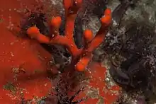 The tree sponge may grow to 150 mm (5.9 in) in height. It is a bright red to dirty orange sponge which grows upright and branches like a tree.[1][2] The surface texture is smooth and the branch tips are rounded.[1] Its oscula are small (<1 mm (0.039 in) and inconspicuous.[1][2] The surface may be covered in a slimy mucus.[2]