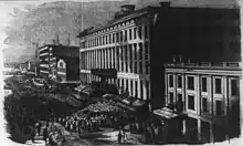 The fourth hotel was designed by John M. Van Osdel, who had designed the previous third hotel. It opened its doors in 1873. It stood six floors.[1] It was constructed James Couch and the estate of his brother Ira Couch, who had himself passed away in 1857.[5][6] The rebuilt hotel remained along with the Palmer House, Grand Pacific Hotel and the Sherman House as a leading hotel after the Great Chicago Fire.[2] It was built in the commercial palazzo architecture style of the day and claimed to be fireproof.[2] James Couch and his son Ira Couch (not to be confused with his late brother of the same name) were the proprietors of the new fourth incarnation of the hotel at its opening.[3] The hotel was one of the city's "big four" post-fire hotels, the other three being the Grand Pacific, Palmer House, and the Sherman House.[16]