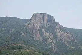 Trescovăț is a Lower Permian porphyry bare volcanic neck in the Iron Gates Natural Park. The peak, well visible from both shores of the Danube, is categorized as a geosite due to its geomorphological feature and trapezoidal shape.[2]
