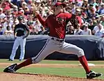 Bauer began retooling his pitching delivery after the 2012 season, and entered spring training with the Indians with the intention of "overwrit[ing] eight to 10 years of neuromuscular programming".[34] He was not named to the Indians' 2013 opening day roster, instead making up part of the starting rotation for the Triple-A Columbus Clippers.[35] He was recalled on April 6 for a game against the Tampa Bay Rays, giving up a career-high seven walks in a 6–0 loss. Bauer's difficulties with fastball command carried through the season, and when MLB rosters expanded from 25 to 40 in September, Bauer was not included among the additional 15.[36] He started four major league games that season, posting a 1–2 record and a 5.29 ERA while striking out 11 batters in 17 innings.[37] In his 22 starts for Columbus, meanwhile, Bauer was 6–7 with an ERA of 4.15. He continued to work on his pitching mechanics during the 2013–14 offseason, blaming his poor performance on bad techniques that he had picked up after suffering his groin injury in Arizona.[38]