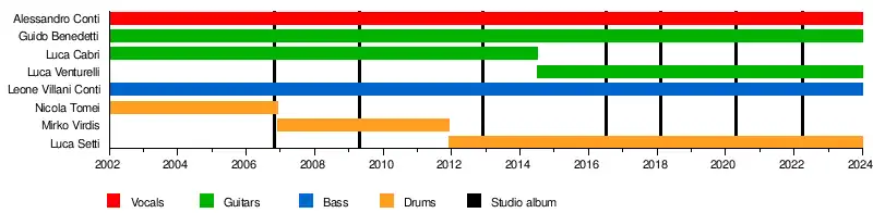 On 7 March 2020 former drummer Mirko Virdis died at age 38 after crashing his car in Formigine.[9][10] On 28 April of the same year, they released their fifth all-original studio album, The Legend of the XII Saints, containing songs inspired by Saint Seiya and based on each of the Zodiac signs.[11]