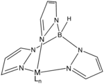 The trispyrazolylborate ligand, abbreviated Tp−, is an anionic tridentate and tripodal ligand. Trispyrazolylborate refers specifically to the anion [HB(C3N2H3)3]−. However, the term can also be used to refer to derivatives having substituents on the pyrazolyl rings. This class of compounds belongs to the family of ligands called scorpionate ligands.[1][2]