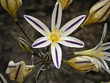 Triteleia is a genus of monocotyledon flowering plants also known as triplet lilies. The 16 species are native to western North America, from British Columbia south to California and east to Wyoming and Arizona, with one species in northwestern Mexico. However, they are most common in California.[1][2][3] They are perennial plants growing from a fibrous corm roughly spherical in shape. They get their name from the fact that all parts of their flowers come in threes.