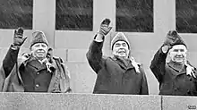 Triumvirate of: (L-R) Nikolai Podgorny, Leonid Brezhnev, and Alexei Kosygin during October Revolution anniversary celebrations in 1973