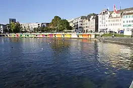 Trompe-l'œil is a 112-meter-long color field painting created in 1998 by Maria Bettina Cogliatti. It overlooks the Katastrophenbucht ("disaster bay") in Zug, Switzerland.