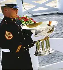 The Arlington Million Trophy being carried. The trophy is awarded to the winners of the Arlington Million horse race