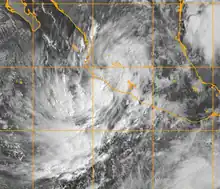 A tropical wave moved off the coast of Africa on September 21, moving across the Atlantic Ocean and Caribbean Sea with little development. On October 1 it entered the eastern Pacific Ocean, and continuing westward it developed an area of persistent convection on October 5.[1] Initially the system was disorganized, although gradual development was expected as conditions in the upper-levels of the atmosphere were expected to become more favorable.[2] On October 7 it developed a broad low pressure area,[3] and by the next day it was located in the eastern portion of a large area of disturbed weather; the western portion of the system later developed into Tropical Storm Olivia. The eastern system developed organized convection near its center, and developed into Tropical Depression Fifteen-E at 0000 UTC on October 9, about 765 mi (1,231 km) southwest of the southern tip of the Baja California Peninsula.[1]