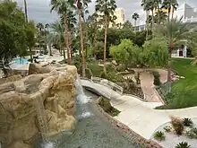 A plaza with tropical landscaping is located at the Tropicana – Las Vegas intersection, in front of the resort and facing the Strip.[141] This area originally featured a water cooling tower, which was covered with a tulip-shaped fountain structure.[5][2] It stood 60 feet,[162][2] and was demolished in 1977, as part of renovation work.[212]