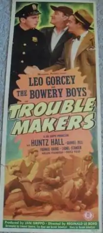 Trouble Makers is a 1948 American comedy film directed by Reginald LeBorg and starring The Bowery Boys. The film was released in 1948 by Monogram Pictures, although the exact release date is uncertain, although two possible released dates are mentioned in different books, December 10, 1948[1] and December 26, 1948.[2] It is the twelfth film in the series.