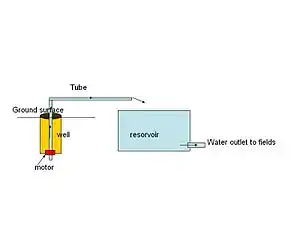 A tube well is a type of water well in which a long, 100–200 millimetres (3.9–7.9 in)-wide, stainless steel tube or pipe is bored underground. The lower end is fitted with a strainer, and a pump lifts water for irrigation. The required depth of the well depends on the depth of the water table.