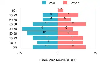 According to the 2002 Poland census, there were 147 people residing in Tursko Małe-Kolonia village, of whom 51.7% were male and 48.3% were female. In the village, the population was spread out, with 23.1% under the age of 18, 36.7% from 18 to 44, 24.5% from 45 to 64, and 15.6% who were 65 years of age or older.[1]