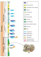 According to the Bayesian tip-dating analysis conducted for Tutcetus, Basilosauridae was a paraphyletic clade that included both traditional basilosaurids as well as all modern whale groups (Mysticeti and Odontoceti).[2] Among core basilosaurids, Tutcetus was recovered within a weakly-supported group of early diverging, middle Eocene whales that also included Chrysocetus from North America and Africa as well as Ocucajea from South America. Within this group, termed the Tutcetus-clade by Antar et al., Tutcetus was found to be most closely related to Ocucajea, with Chrysocetus having diverged before the split between the other two.[1]