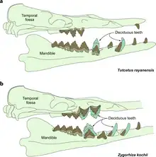 The upper and lower premolars of Tutcetus differ from those of all other basilosaurids in the number of accessory tooth cusps. Tutcetus features two mesial accessory cusps (directed towards the front of the jaw) and three distal accessory cusps (directed towards the back of the jaw). The premolars also differ in some other aspects. They are notably more gracile than those of other basilosaurids and the tooth enamel is much smoother. The fourth premolar appears to have been the largest tooth in both the upper and lower jaw. The first premolar does not appear to have had a replacement, which suggests one of two things. Either the deciduous first premolar is retained even into adulthood, or the first premolar is developed without having a temporary precursor.[1]