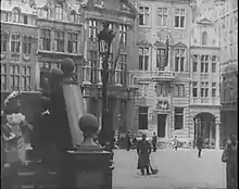 A young boy and his sister see a motor-car ready to depart in front of their house. They hook their little cart to the back of it, step in and drive along until they reach the Place Royale (English: Royal Square), with the statue of Godfrey of Bouillon in its center and the Palais de Justice (English: Law Courts of Brussels) in the background. From there, they walk on to visit the Grand-Place and watch the Manneken Pis being dressed.
