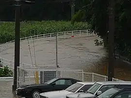 The last location Chataan affected was Japan. The typhoon forced the cancellation of 316 flights[22] and 150 train trips. The expressway between Shizuoka and Tokyo was closed.[23] At least 396 schools were closed in the country,[22] and a baseball game between the Yokohama DeNA BayStars and the Yakult Swallows was canceled due to the inclement weather.[24] Toyota temporarily closed most of its factories in the country.[25] Heavy rainfall, peaking at 509 mm (20.0 in) in Gifu Prefecture, fell across Japan. The rains flooded 10,270 houses in the country,[26] resulting in evacuation orders for about 145,000 people.[27] The floods damaged roads in 338 locations, and at least 10 bridges were destroyed.[28] About 15,000 evacuees were in Ogaki after a river exceeded its banks.[5] High rainfall caused hundreds of landslides,[15] two of which resulted in a death.[29] Floods killed at least three people.[15] Winds from the typhoon peaked at 97 km/h (60 mph) at Hachijō-jima.[26] High winds in Sakai, Osaka damaged 20 houses.[22] In Tokyo, the storm produced light winds and rains, despite passing within 102 km (63 mi).[5] Chataan destroyed 21 homes and damaged 239 others to some degree. During its passage, the typhoon destroyed 258.6 km2 (99.8 sq mi) of crops. The typhoon killed six people, left one person missing, and injured 30 others. Overall damage in Japan totaled about $500 million (¥59 billion 2002 JPY).[nb 4][26] During the storm, Yahoo! Japan received a record 359 million views, mostly due to people checking the website's weather section.[31]