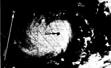Shortly after attaining typhoon intensity, Dot entered a period of explosive intensification. However, this was not expected by forecasters at the JTWC nor the forecast models due to the presence of dry air.[1] At 0600 UTC on October 15, the JTWC revised the intensity to 165 km/h (105 mph), equivalent to a mid-level Category 2 hurricane on the United States-based Saffir-Simpson Hurricane Wind Scale (SSHWS). That evening, the JMA increased the intensity of Dot to 165 km/h (105 mph), making it the strongest tropical cyclone of the season.[5] At 2300 UTC on October 15, Hurricane Hunters measured a minimum barometric pressure of 906 mbar (26.8 inHg), a drop of 63 mbar (1.9 inHg) over the previous 23 hours, equal to a drop 2.8 mbar (0.083 inHg) per hour. This rate exceeded the threshold of explosive intensification, which according to the JTWC, is 2.5 mbar (0.074 inHg) per hour.[1] Based on the aforementioned aircraft reports, the JTWC increased the intensity to 260 km/h (160 mph) at 0000 UTC on October 16. By this time, Dot had developed a well-defined eye surrounded by very cold cloud tops.[5] However, the JTWC also noted that both the storm's radius of maximum winds and central dense overcast were unusually small.[1]