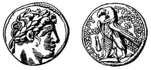 They also bore the Greek inscription ΤΥΡΟΥ ΙΕΡΑΣ ΚΑΙ ΑΣΥΛΟΥ (Týrou hierâs kai asýlou, 'of Tyre the holy [city] and [city] of refuge').[1] The coins were the size of a modern Israeli half-shekel and were issued by Tyre, in that form, between 126 BC and AD 56. Earlier Tyrian coins with the value of a tetradrachm, bearing various inscriptions and images, had been issued from the second half of the fifth century BC.[2]