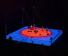 The surface of the stage is covered with several models of LED video tiles provided by Fuse:[58] 812 YesTech MG7S floor panels and 56 YesTech MG7S custom circular panels with a 3.9-millimetre (0.15 in) pixel pitch, 2 YesTech MG7S corner panels, 168 YesTech MG11 panels, 42 ROE Vanish V8T panels measuring 1 by 1 metre (3 ft 3 in × 3 ft 3 in), and 63 DesignLED custom flexible tiles measuring 400 by 225 millimetres (15.7 in × 8.9 in).[22] The ROE Vanish panels were chosen for the edges of the stage due to their acoustic transparency, allowing sound from speakers placed underneath the stage to reach the general admission audience.[22][46] Using the LED tiles, the stage can be lit by an ever-changing cycle of generative "colourscapes" using the algorithm used for Eno's "Turntable".[15][59] At the request of Williams, Eno added a few rules to his algorithm to limit the intensity and duration of certain colours such as green that were considered problematic for lighting the older band members.[13] Along the front and sides of the stage, robotic cameras film the shows;[46] the camera system uses seven Sony Venice 2 units, two Marshall CV380s, two Panasonic UE-100s, and one Panasonic UE-150 PTZ.[13]
