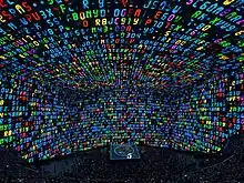 The second song, "The Fly", utilises a presentation similar to the one from the Zoo TV Tour, with a barrage of rapidly flashing words and aphorisms displaying on screen that recalls the work of Jenny Holzer.[100] The imagery undergoes a perspective shift, causing the optical illusion that the venue's geometry is cube-shaped rather than spherical. At the song's midpoint, seven-segment digital letters and numbers in a rainbow of colors slowly begin to fill up the entire screen from bottom to top, before the ceiling appears to fall towards the audience.[101] For "Even Better Than the Real Thing", Brambilla's kaleidoscope video piece "King Size", comprising imagery of Elvis Presley and various Las Vegas iconography, plays on the screen, scrolling from ceiling to floor to make the audience feel the false sensation of the stage moving upward.[102] "Mysterious Ways" is performed next, with the screen displaying moving bars of light that David Barbour of Lighting & Sound International said "creat[ed] a kind of Zoetrope effect".[13]