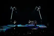 Williams believed that not enough thought had been given to the Sphere as a performance space when its in-house lighting system was designed. According to him, Sphere officials "looked at [him] completely blankly" when he asked about their intended solution for providing backlight.[22] He also considered the venue's lights to be limited in their usefulness, since they are mostly positioned along the balcony rails and thus can only "provide a flat front light or point at the screen".[23] Williams subsequently collaborated with Murphy to design a custom lighting system for U2's residency.[35] The team faced difficulties finding a suitable location to place lights in the venue without resorting to hanging trusses that would obscure the LED screen.[23] Though they could rig lights behind the Sphere's video screen, their backlight would be insufficient and they would obstruct the on-screen visuals. Williams explored several solutions, such as scissor lifts, louvred screen panels and arches, before settling on four articulating "lampposts" that he and Lipson designed.[23][35] Their design was partially inspired by pumpjacks of oil wells.[22] To maximise visibility of the screen, Williams wanted the posts to be as thin as possible, but this came at the expense of their weight carrying capacity. As a result, the team was forced to attempt "to reinvent live entertainment with a sum total of twelve back lights".[23] The lighting team was onsite in Las Vegas about 50 days before the residency's first show in order to begin conducting their design review.[35]