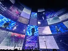 The high resolution of the interior LED screen posed several challenges, the biggest of which was building a video playback system that was suitable for live concerts, according to Williams. The Sphere's in-house playback system, provided by 7thSense, was designed to display high-resolution films but not with a timeline-based interface that is typical in the live concert industry.[23] Desmedt consequently engaged the firm Disguise, which had worked with U2 since their Vertigo Tour in 2005, for help building a media server system that could seamlessly integrate visuals from different sources;[34] it needed to play pre-rendered video content (most of it created at a 12K resolution), integrate live IMAG from cameras, and manipulate imagery, all in a manner more familiar to concert touring personnel.[23] Desmedt served as technical director to design the system,[22] with Disguise involved for six months.[34] According to him, one of his biggest challenges was working with the new SMPTE 2110 standard for transferring digital media over IP networks. Finding manufacturers that were willing to convert to the standard's 4096 × 2160 (DCI 4K) resolution proved difficult. Ultimately, Disguise's GX3 media servers were selected to handle playback, and the firm developed new IP video format conversion (IPVFC) cards for the servers that could output resolutions three times higher than DCI 4K over serial digital interfaces.[22] The show's high-resolution video requirements also meant that for some sequences, every frame of video was initially taking the video artists 15 minutes to render, according to Williams; Treatment's technical lead Brandon Kraemer consequently served as technical director in designing a viable workflow for the artists in collaboration with Desmedt, Disguise, and Fuse.[22][23]