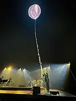 For "One", the video imagery displays a starfield.[103] An interlude follows during which the group performs a stripped-down cover of Elvis Presley's song "Love Me Tender",[99] accompanied by clips of Elvis's wedding to Priscilla Presley, John F. Kennedy's "We choose to go to the Moon" speech, and an Apollo rocket launch.[14][104] "Until the End of the World" is performed next, during which footage of storm clouds, lightning, and rising water are shown on screen.[93][105] The song culminates with Gerrard's video art piece "Flare", with shows a gas flare burning in the shape of a flag;[14] set in the open ocean, it is meant to "to illustrate warming seas and pollution".[105] Transitioning into the song "Who's Gonna Ride Your Wild Horses", the flare visual on screen breaks apart into flaming embers falling from the ceiling, as closeups of the band members are also shown.[14][102] For "Tryin' to Throw Your Arms Around the World", a digital chalk drawing of a balloon, designed by the Edge's wife Morleigh Steinberg, is displayed high on screen. It is attached to an actual tether of knotted-up bedsheets that Bono holds. Initial performances featured him picking a fan from the crowd to join him on stage to hold the tether and swing in it;[106] later performances added a prop door, with the story being that Bono had returned home only to find himself locked out and looking through the peephole.[107]