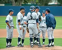 An Anteaters coach conducts a mound visit during a 2010 game at George C. Page Stadium