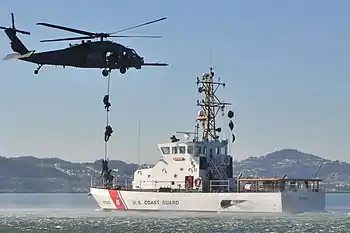 Members of the U.S. Coast Guard Maritime Safety and Security Team 91105 descend from a U.S. Air Force HH-60G Pave Hawk from the 129th Rescue Wing, California Air National Guard, Moffett Federal Airfield, California, onto Tern in the San Francisco Bay Jan. 28, 2009. Crewmembers conducted vertical insertion training, which is a fast-paced technique used to effectively deploy law enforcement teams to a high-risk situation. On January 29, 2009, Tern, Coast Guard Air Station San Francisco, and the 129th Rescue Wing, California Air National Guard rescued a pilot who crashed his plane near Pillar Point Harbor. The rescue ironically occurred the day after Coast Guardsmen and Air National Guardsmen conducted training in the San Francisco Bay.[3]