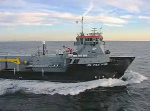 USNS Westwind (T-AGSE-2) is a Black Powder-class submarine and special warfare support vessel acquired by the U.S. Navy in 2015 and assigned to the US Coast Guard's MFPU (Marine Force Protection Unit) at Naval Submarine Base Kings Bay. Although she is a Black Powder class ship, she was built to mirror the Black Powder. She has been modified multiple times since the Navy purchased her in 2015. Her most recent upgrades have brought in a new gun system, updated crew quarters, and a remodeled bridge.