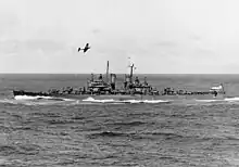During the ensuing Formosa Air Battle on 13 October, Mobile's sister ship Houston and the heavy cruiser Canberra were both torpedoed and badly damaged by Japanese aircraft. Mobile and several other vessels were detached from TF 38 to cover the withdrawal of what was nicknamed "Cripple Division 1". The American forces hoped that further Japanese forces would be lured out to be destroyed, but the Americans were detected by Japanese scout aircraft and the bait was not taken. Once the damaged vessels had withdrawn far enough to be out of range of Japanese aircraft, Mobile left the formation and returned to TG 38.3, arriving with her unit on 17 October.[3][4]